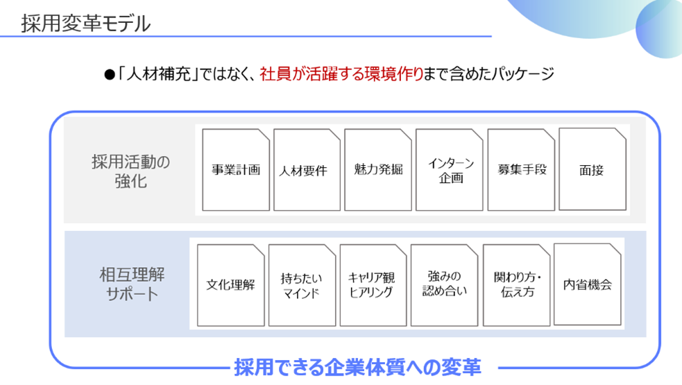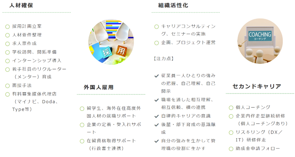 私は、中小企業の人材確保と、社員が活躍できる職場作りの両輪のサービスを提供しているキャリアコンサルタントです。人材確保とは単なる欠員補充ではなく、「選ばれ、活かされる企業体質への変革」そのものだと考えています。企業の活動を伴走しながら、一方で社員に対する面談やキャリアセミナー、制度作りを行い、社員が活躍できる職場環境作りを同時に目指している点が大きな特徴です。